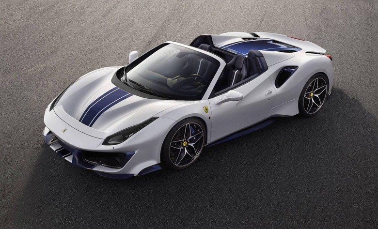 Ferrari is at the Pebble Beach car event this week, and as a surprise it's revealing the 50th convertible in the carmaker's history. It's the 488 Pista Spider, and just like the hardtop 488 Pista it features the most powerful V8 engine Ferrari has ever made, boasting 711 horsepower. The company has adorned the car in white with blue stripes, in part to acknowledge its debut on American soil, as well as recognize the popularity of convertibles in the country.