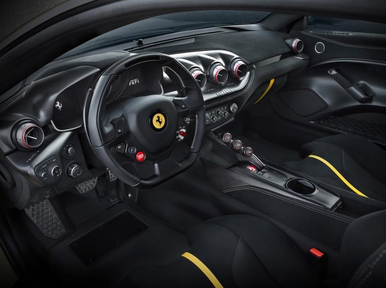 Together, they're good for a 0-62 mph run in 2.9 seconds, while 124 mph arrives in just 7.9 seconds. Ferrari isn't giving a specific top speed, saying only that the F12 TdF will manage "in excess" of 211 mph.
