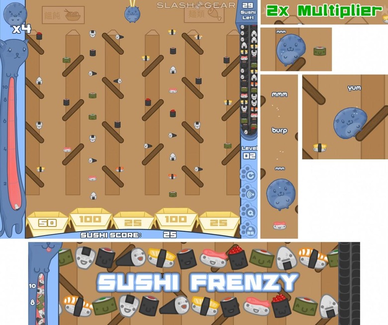 The cat, once released, bounces and falls to the bottom of the screen like Plinko from The Price is Right. You can lose, but it's difficult to not have fun while playing, no matter how many sushi you eat in one go.