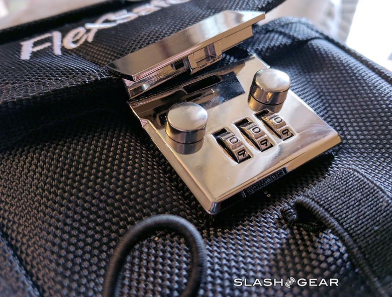This FlexSafe has all the basics – that's a theft deterrent pack that's water resistant (not waterproof) and has a bunch of loops for straps and additional bits and pieces. This version of the FlexSafe can fit a few smartphones, glasses, keys, and a wallet. It's not super big – it's just big enough for the basics.