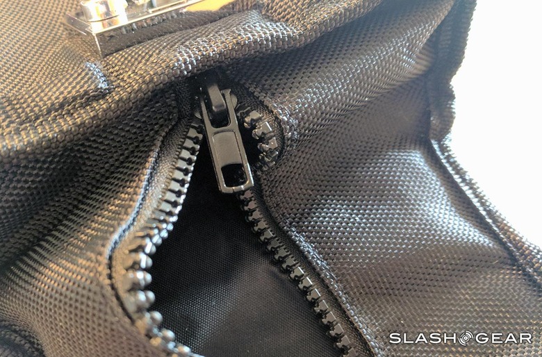 The material this pack is made with is layered, made to be extra "slash-resistant." The layers include a nylon interior, a layer of RFID blocking material, a thick 3MM EVA layer for rigidity, then two slash-unfriendly layers. The exterior is a 168D denier nylon – it's sorta slippery, on purpose.