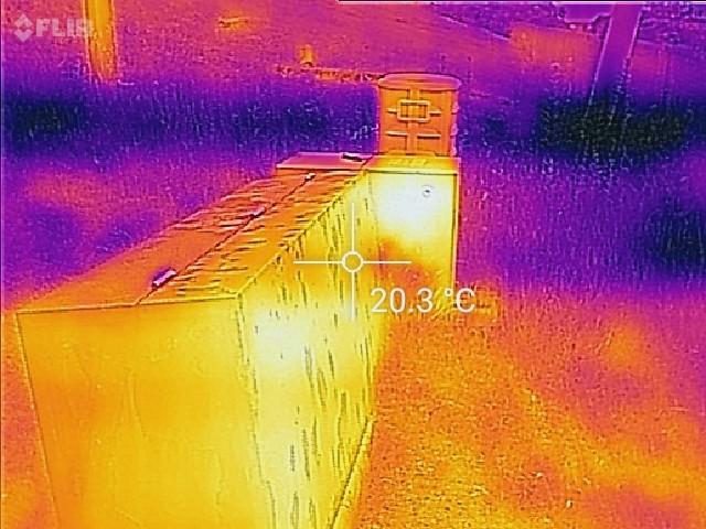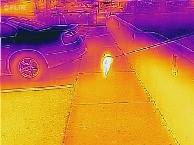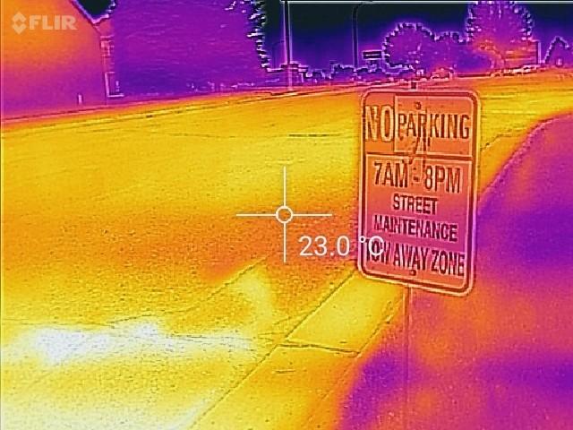 Remember as you're viewing these photos that they mix the visual spectrum and infra-red, so not everything you see is as it seems. The road sign here, for example. The letters aren't cooler than the sign, they're just appearing as such because the camera is picking up their very dark color against the sign's very light color.