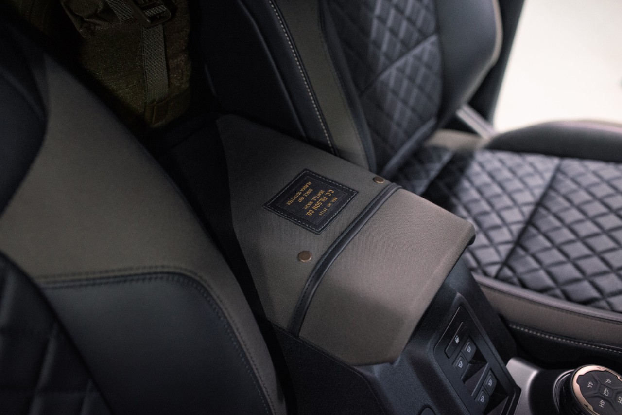 The Ford Bronco + Filson Wildland Fire Rig concept is based on a production four-door Bronco SUV kitted with the Sasquatch Package. It features a bold array of off-road accessories including a bold, new interior design crafted from rugged Filson fabrics. This includes quilted black leather upholstery, durable otter green duck canvass interior trimmings, a fireproof ripstop nylon top and rear cargo area divider, and Cerakote ceramic-coated wheels for long-term protection against rust and corrosion.