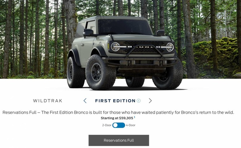 Bad news if you were hoping to snap up one of Ford's well-spec'd 2021 Bronco First Edition trucks. The reservation system for the upcoming SUV may only have gone live last night – and production isn't even due to start until early in 2021 – but if you decided to sleep on staking your claim, you're out of luck.