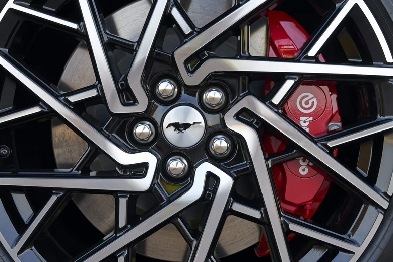 It's equipped with 20-inch machined-face aluminum wheels, with high-gloss black-painted pockets and aero covers. Ford fits them with 245/45R20 Continental all-season tires as standard. Behind them, there are red-painted performance brake calipers, clamping down on 385 mm ventilated front rotors and 316 mm solid rear rotors.
