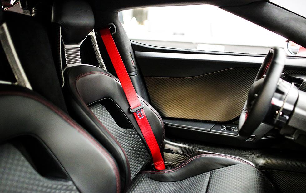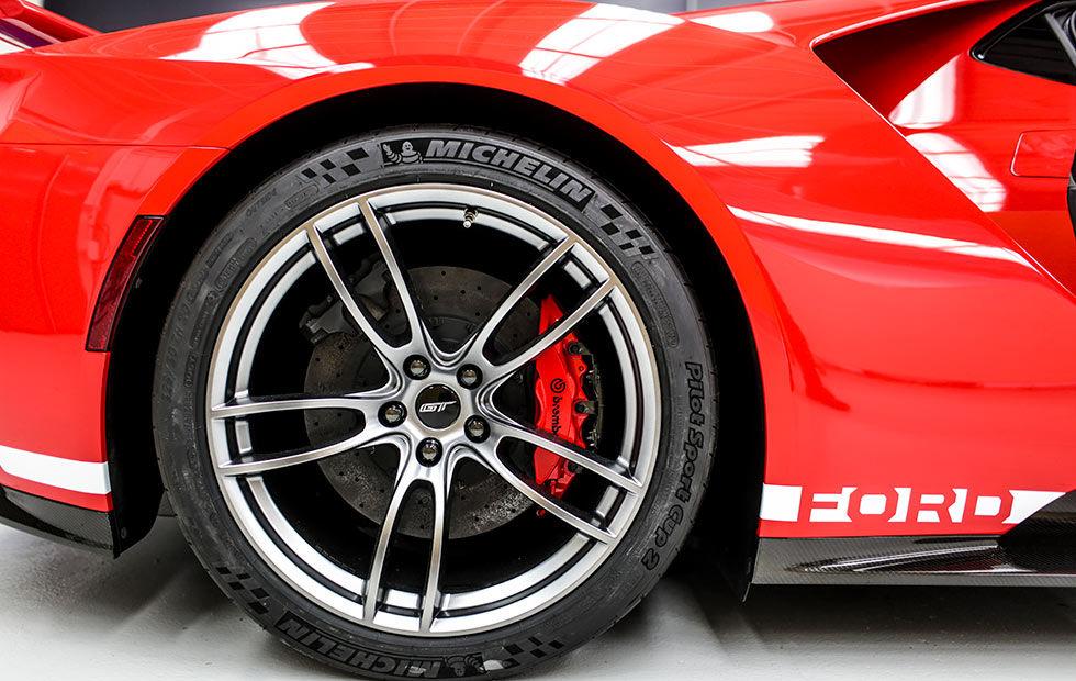 The Ford GT '67 Heritage edition has glossy Race Red exterior color with a pair of white racing stripes and exposed carbon fiber package. The hood and door graphics are in Frozen White and the car rolls on 20-inch forged aluminum wheels in an exclusive silver satin clear coat color with black lug nuts. The brake calipers are red and the rear view mirror caps are silver completing the retro look of the car.
