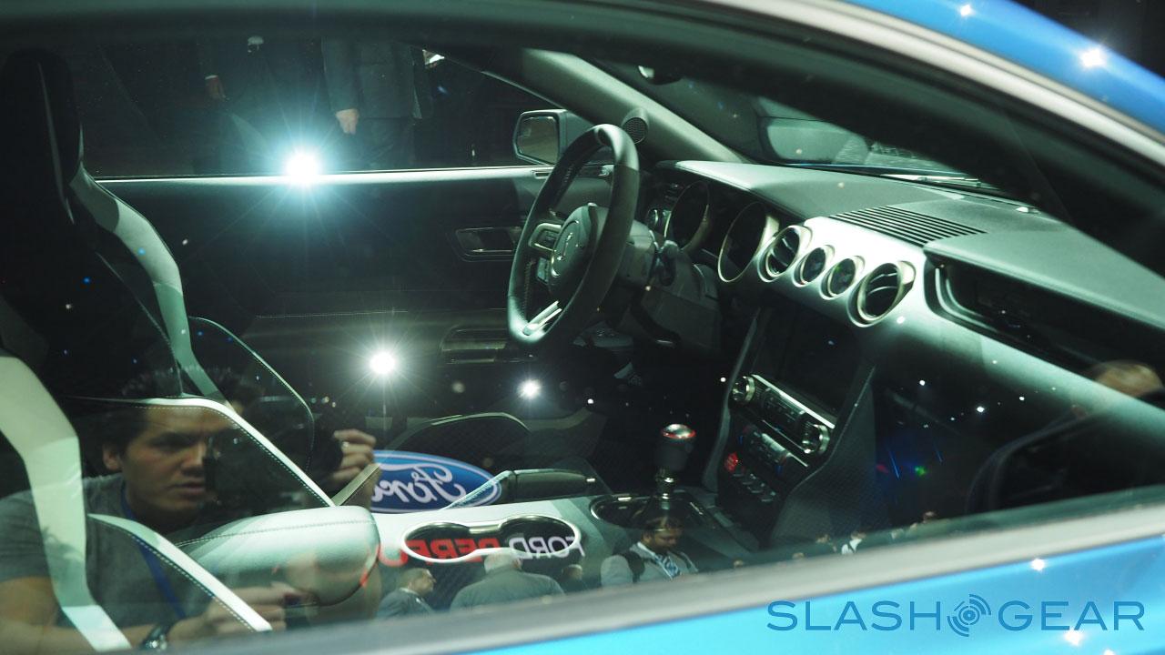Inside this vehicle you'll find "high contrast" red stitching as well as Shelby GT350R badging. There's also a D-shaped steering wheel with an eye-searing red center mark right up top.