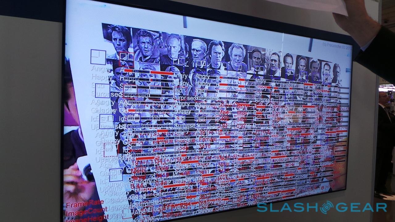 Behind the scenes, the magic is in the huge amount of education Fraunhofer has given the system, teaching it to recognize common schema of mood and reaction from thousands of images of expressions. Called the Facial Action Coding System (FACS) it allows the computer to quickly calculate what each viewer is showing in a matter of milliseconds. That's even if there are dozens of people in the frame, too; Fraunhofer showed the camera a print out covered in face thumbnails – over a hundred of them, packed tightly together – and SHORE spotted them all and ran its mood analysis. The system has short-term memory, too; Fraunhofer tells us that faces aren't stored long-term, but there is a shorter-term caching system which can spot if a face was in-frame very recently, and collate all the data from each sighting. Each gets a temporary ID code, and a timer to show how long they were attentive for.