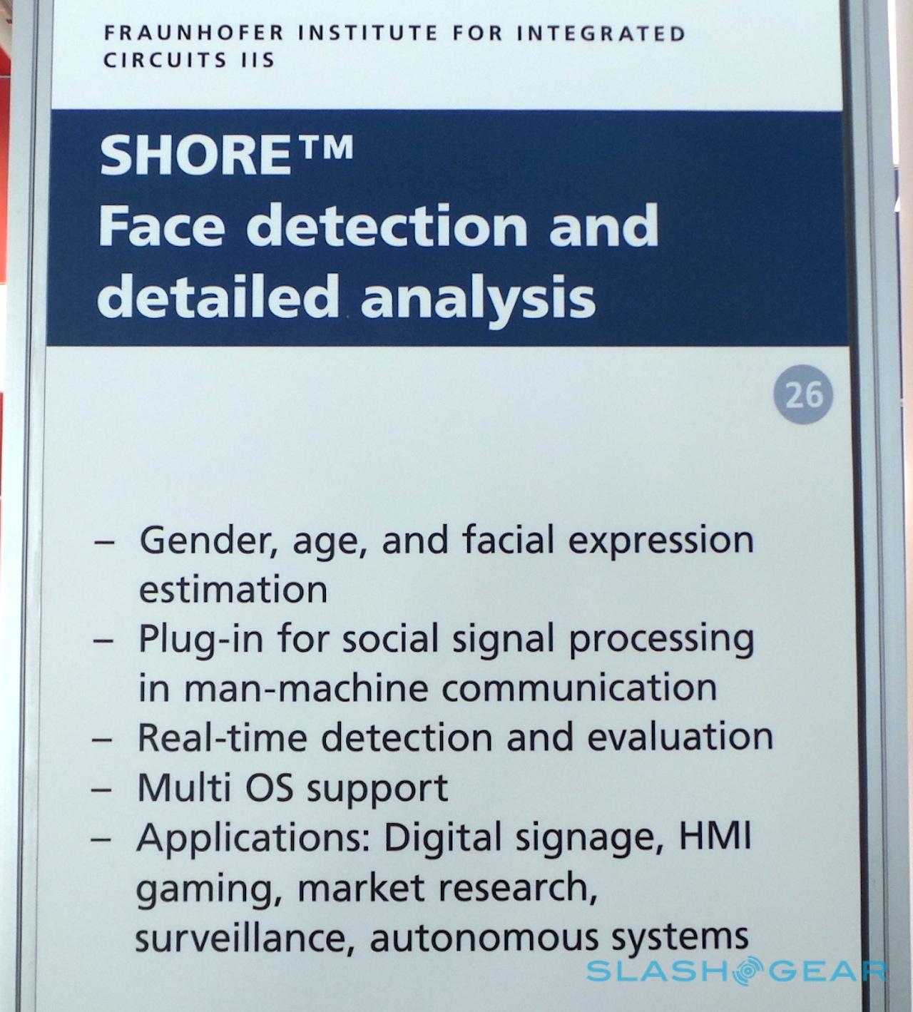 In Fraunhofer's demo, a computer running SHORE was able to identify and classify multiple people walking in and out of frame, with the results of the analysis floated over each person on a wall display. The measurements happen almost instantaneously – the research institute says SHORE can identify a face at 107.5fps if it's directly facing the camera, while full analysis including facial expression detection is at 45.5fps – and the system can handle head tilts of +/- 60-degrees and head rotation of +/- 90-degrees.