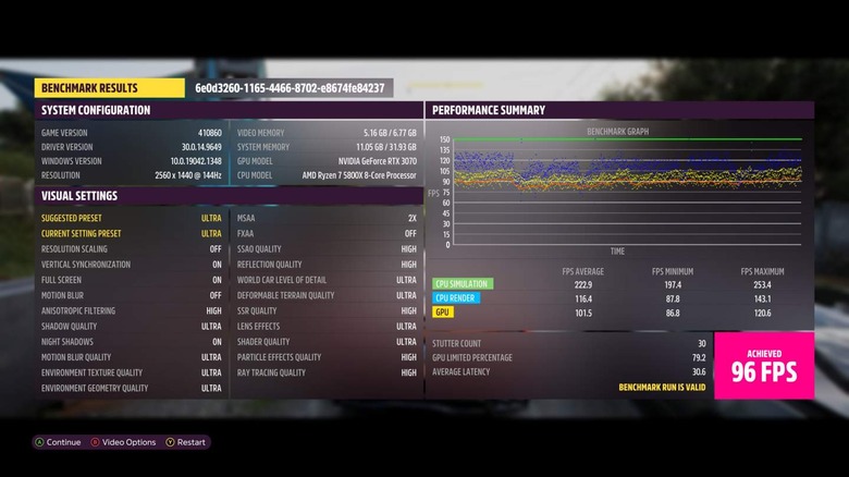 I'm running the game on the Ultra preset, and Forza Horizon 5's benchmarking tool shows that I get in the mid-90s in terms of average framerate. I play with a framerate counter at all times when reviewing a game, and the benchmark results are in line with my experience while playing normally – some dips and spikes depending on what's being displayed, but for the most part, my framerate comes in between 90 and 100 fps. Keep in mind, too, that I'm running the game at 1440p, so someone with a similar build running at 1080p should see a notable FPS increase over what I have.