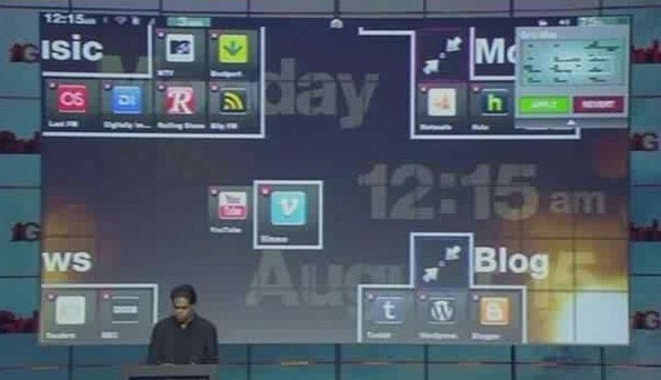 The Grid-layout homescreen consists of various "clusters" of apps, which can be collapsed into a single square, and using a grid-map to show an overview of whole desktop. Unlocking the device involves signing your name with your finger. There's a chromeless-browser and a new email app which can show messages in a traditional three-pane layout or by pulling important messages out as tiles.