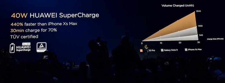 We need to take any company's own internal testing with a grain of salt, mind you. Huawei's suggestion was that in 30 minutes, iPhone Xs Max will have gone from zero to 540mAh. Note 9 will have gone to 1400mAh in 30 minutes, according to Huawei, and the Mate 20 Pro's battery will be at 2940mAh.