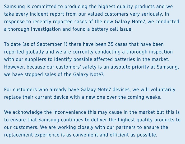 AT&T has issued a statement to the press. This statement reads as follows: "Samsung has notified us that they have identified a battery cell issue in certain Galaxy Note7s. They have asked all retailers, including AT&T, to stop selling the device. We are in the process of determining the exchange process for our customers and how they can replace their current Note7 as quickly as possible. We will have more information later today."