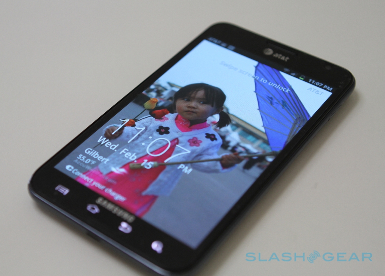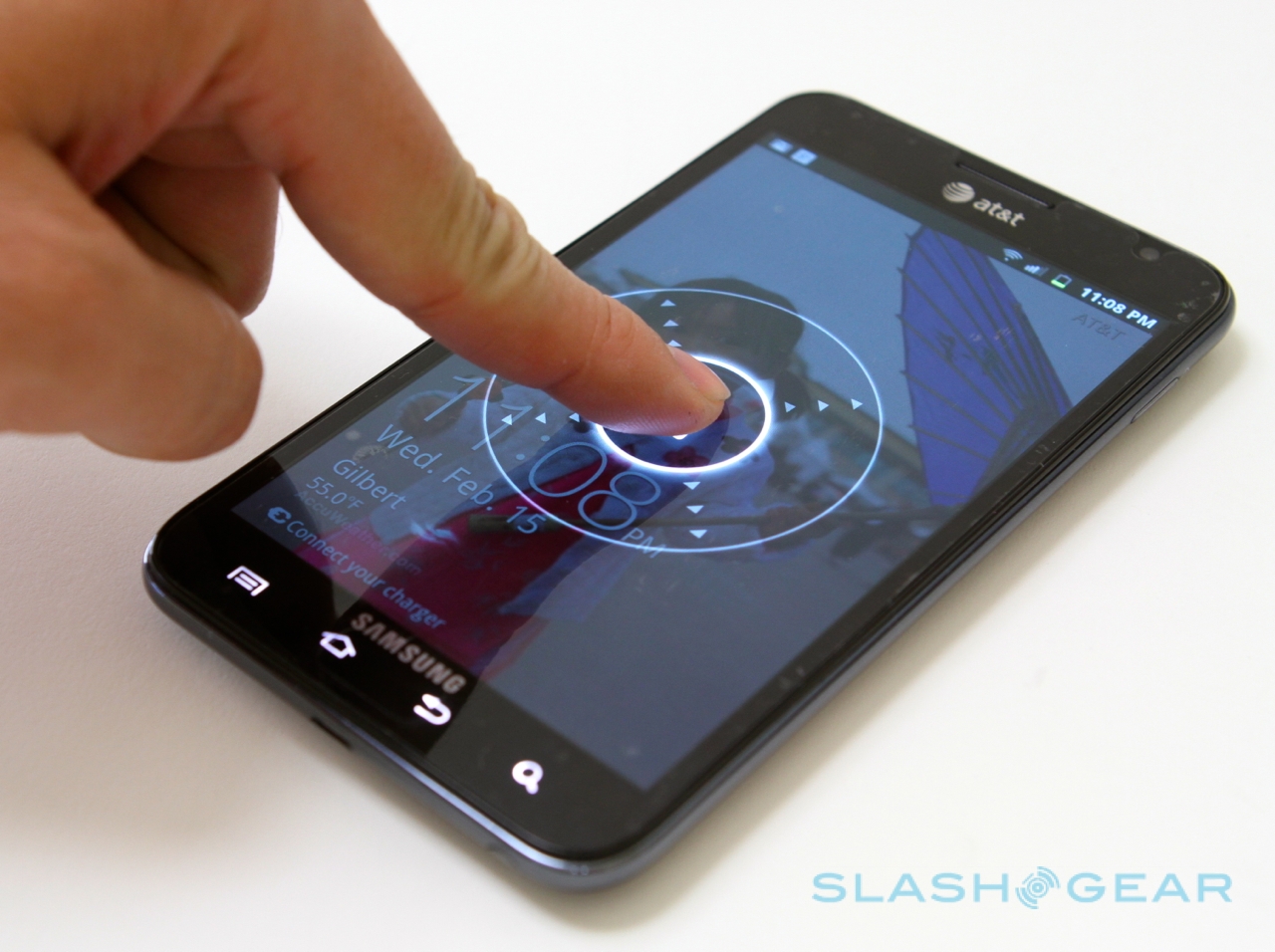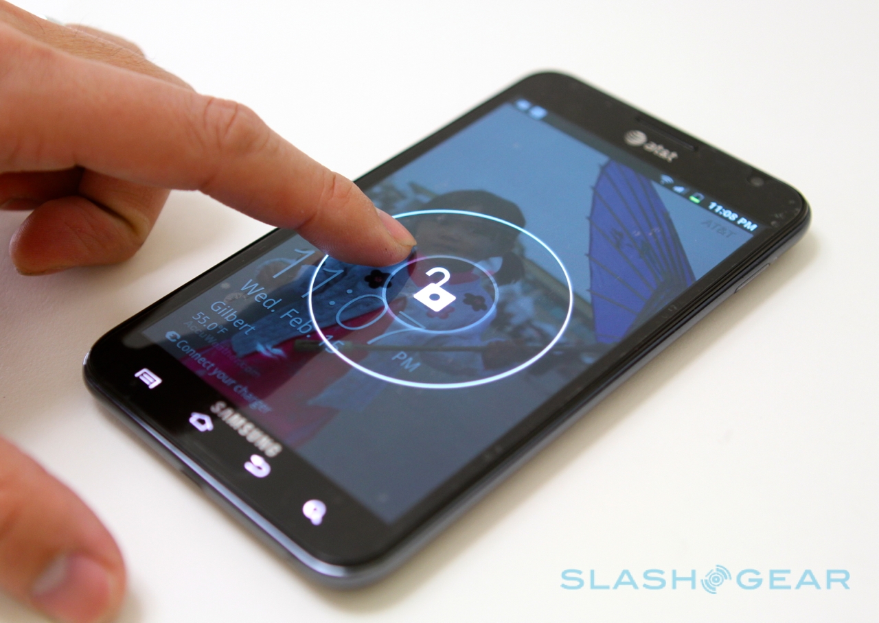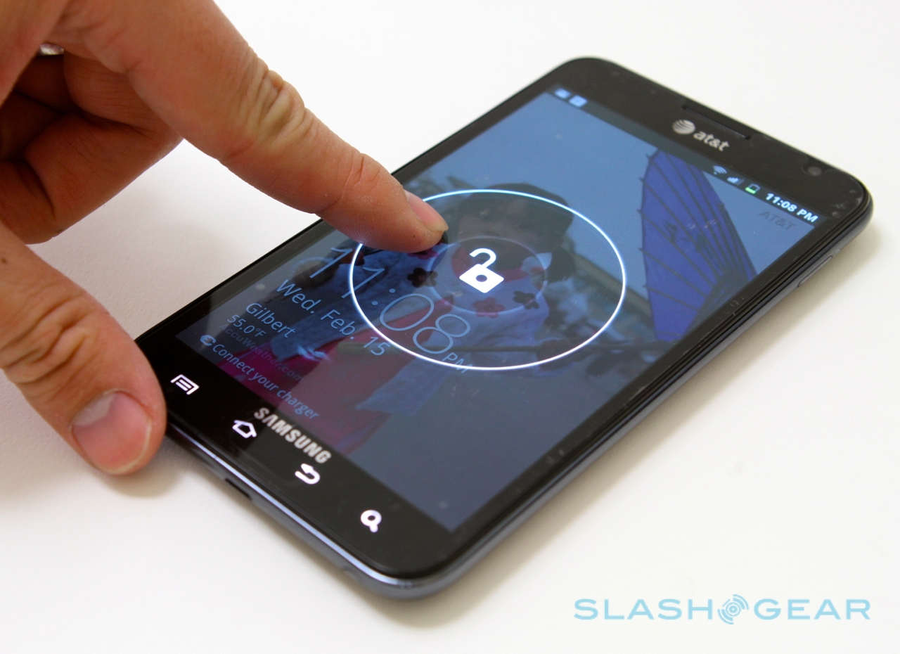 Differences between the two models are small. The AT&T Note drops the physical home key and uses the space to accommodate four capacitive buttons, which I'm assuming will be still in play even after the phone gets its Ice Cream Sandwich upgrade. Cosmetic differences include the lock screen: you no longer slide to unlock, but instead touch anywhere on the display and slide it in any direction.