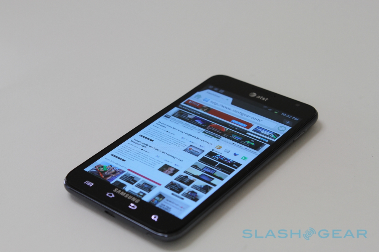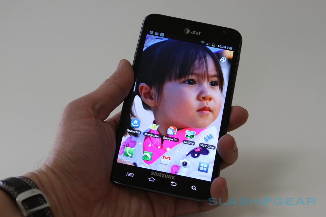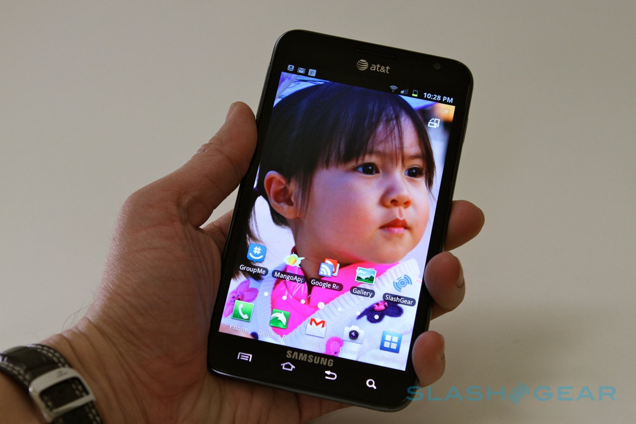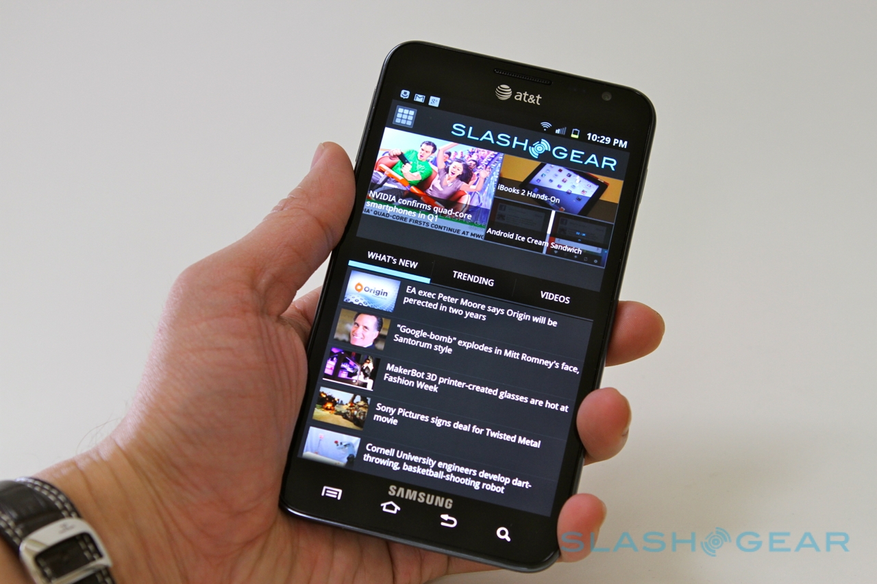 Differences between the two models are small. The AT&T Note drops the physical home key and uses the space to accommodate four capacitive buttons, which I'm assuming will be still in play even after the phone gets its Ice Cream Sandwich upgrade. Cosmetic differences include the lock screen: you no longer slide to unlock, but instead touch anywhere on the display and slide it in any direction.
