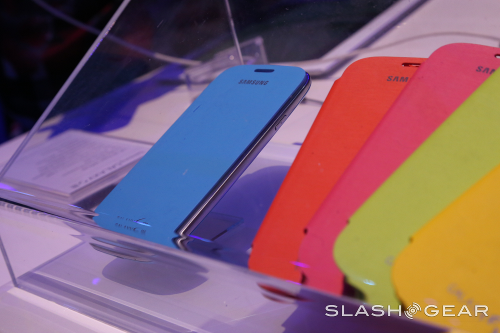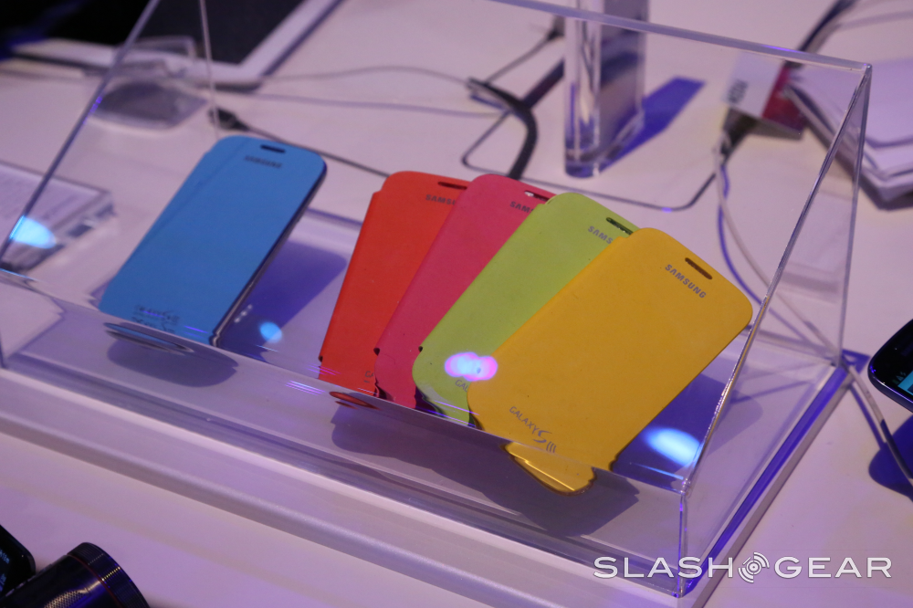 Then there's the flip-up covers of all colors under the rainbow, sitting on top of a Galaxy S III on the left here in the case with several other vibrant colorways available on the right. You'll find that these are pretty much the first front-protecting case items offered by the manufacturer in the history of mobile. Samsung isn't saying their screens aren't tough, they're just saying that bright colors are fun! There are also several basic clear cases included here as well.