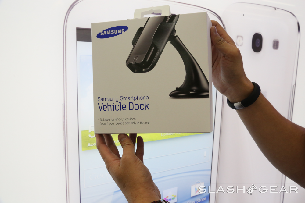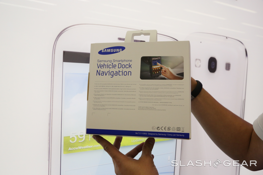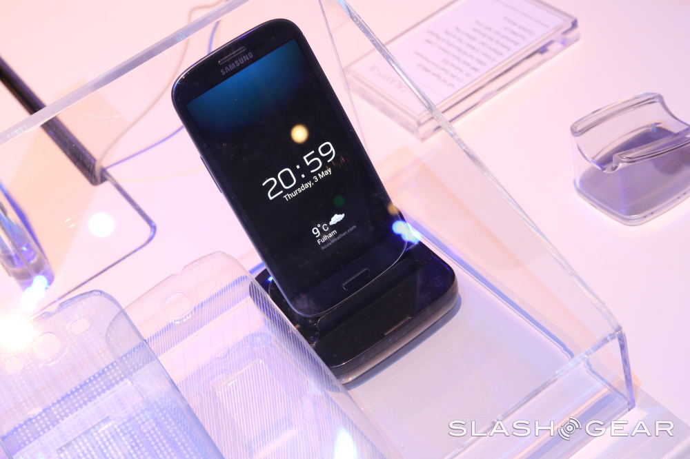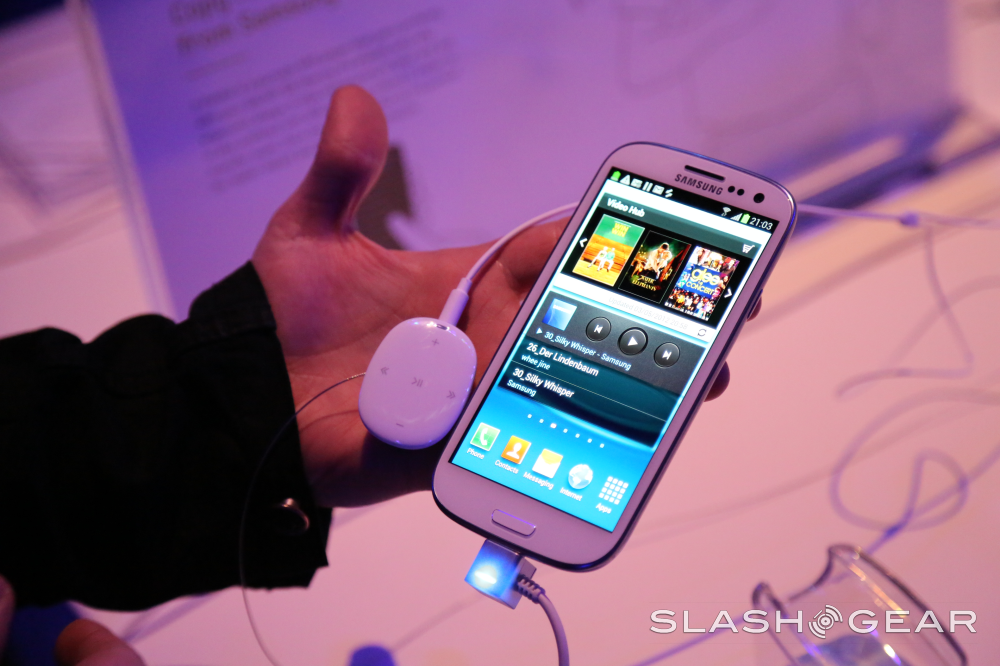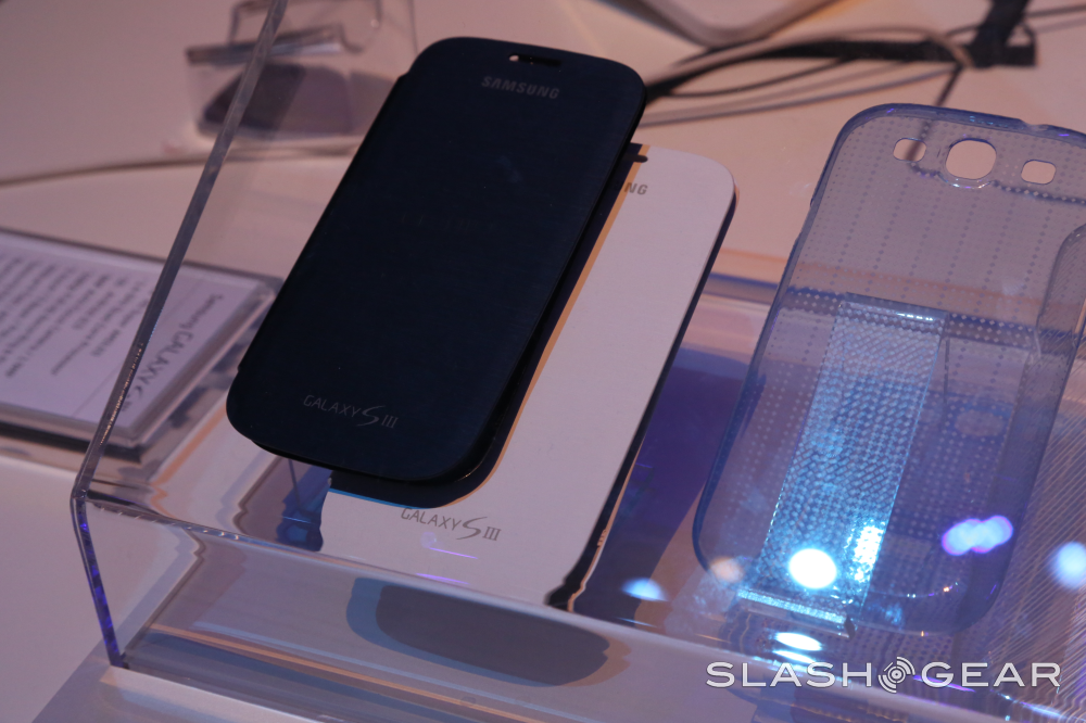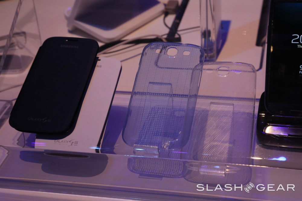 Today we've gotten the opportunity to not only get a look at the Galaxy S III in-person, but to look at the accessories that go with it as well. What you'll see here is a set of fold-over covers, cases of all shapes and sizes, and a charging dock that's almost, but not quite, that lovely wireless charger you've heard so much about. You'll also get a peek at the Samsung S Pebble, also known as a tiny MP3 player accessory that connects to your Galaxy S III with a tap, and a peek at AllShare Cast for wireless transmission of HD video!