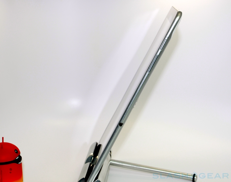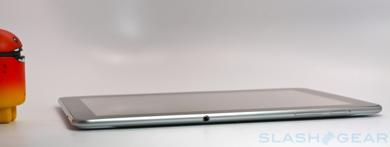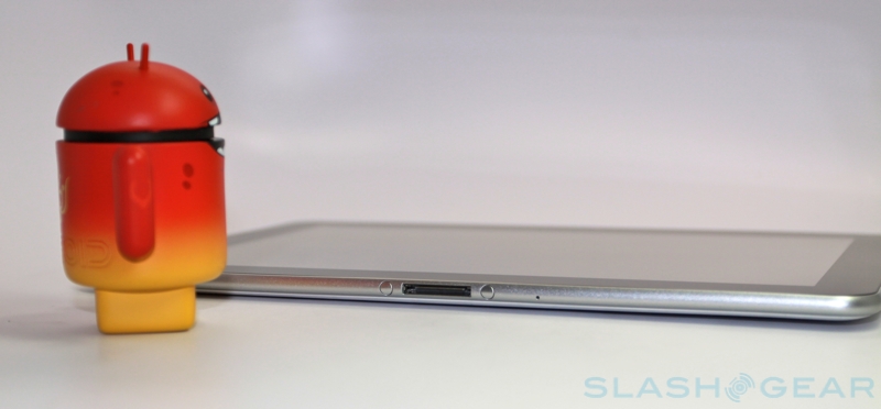 Ports include a dock connector on the bottom edge – which will support 1080p HD with the right adapter, unfortunately absent – along with a 3.5mm headphone jack, though no dedicated HDMI or even USB. That leaves owners relying on whatever adapters Samsung offers for hooking up a wired keyboard and mouse, or using Bluetooth peripherals. Stereo speakers are on either side, rather than on the bottom edge as in the 10.1V. Physical controls are limited to power/lock and the volume rocker on the top edge. A microphone is on the bottom.