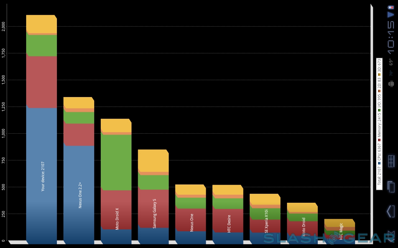 With the same processor as the other Honeycomb tablets we've reviewed, it comes as no surprise to find the Galaxy Tab 10.1's performance broadly in line. That means generally snappy reactions, though some periodic lag or hiccups that may well be Honeycomb in need of finessing. Benchmarking tool Quadrant came in with a total of 2107 with a CPU result of 6367.