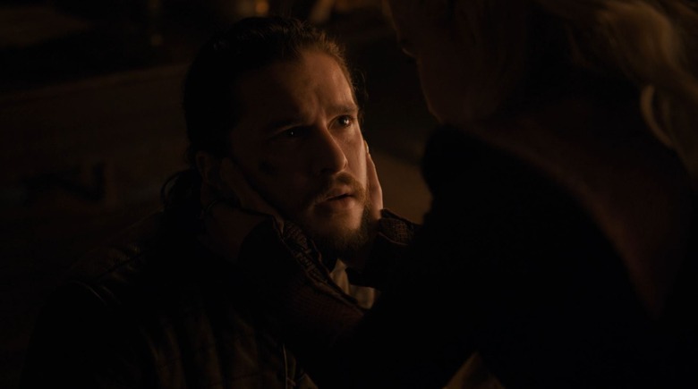 After the feast, Jon and Daenerys meet privately to discuss the revelation that he's actually a Targaryen and not, in fact, Ned Stark's bastard. Jon says that he doesn't want the Iron Throne even though he has the stronger claim to it, and Dany tries to convince him to keep his true parentage a secret from everyone. When he says that he plans to tell Sansa and Arya the truth, Dany grows cold and leaves him.
