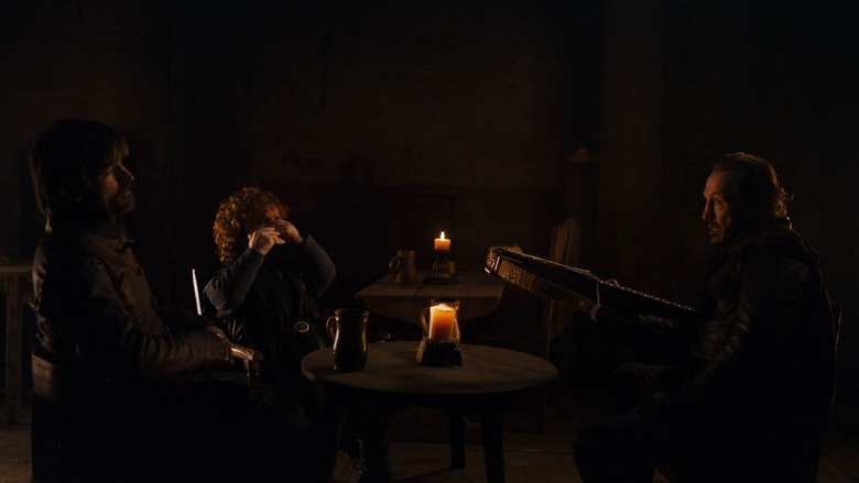 As the army prepares to move out, Jon meets with Sansa, Arya, and Bran in the Godswood. Sansa and Arya ultimately learn of Jon's true parentage and are sworn to secrecy, so of course more people are going to find out. Bronn reappears in the middle of the night, pointing a crossbow at Jaime and Tyrion. He tells them that Cersei offered to make him the Lord of Riverrun if he killed her brothers, to which Tyrion counteroffers Highgarden if Bronn lets them live and Dany wins the oncoming war. Bronn agrees, and the two Lannister men avoid a face-to-face encounter with a crossbow.