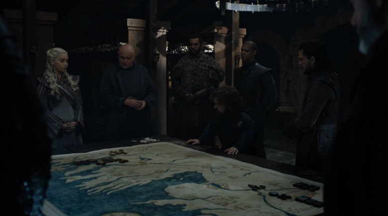 Then it's time to come up with the plan of attack. Dany wants to move on King's Landing right away but Sansa thinks that the soldiers should have more time to rest and recover after the battle with the dead. Jon ultimately sides with Dany and the group comes up with a plan that will see one portion of the army march to King's Landing down the Kingsroad while Dany and the remaining soldiers are ferried to to Dragonstone with what Yara Greyjoy has managed to reclaim of the Iron Fleet.