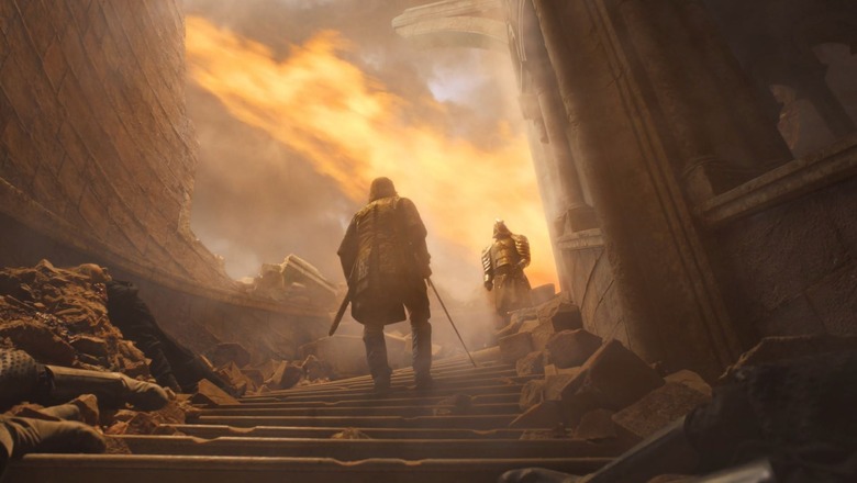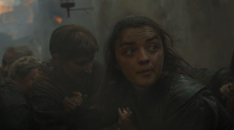 As The Hound and Arya make it deeper into the Red Keep – which is crumbling around them because of Dany's attack – The Hound convinces Arya to leave the city and survive. At the last moment, she abandons her goal of killing Cersei and begins her escape, while the Hound presses on to find his brother. Jaime, who didn't make it through the gates of the Red Keep before they were closed, instead tries to enter the castle from the beach. There he encounters Euron, who survived Dany's attack and has made it shore.