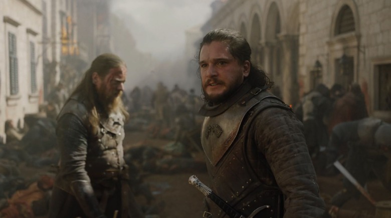 The episode opens with Varys writing letters to unknown recipients about the critical information he knows: Jon Snow is actually Aegon Targaryen, son of Rhaegar Targayen and thus the rightful heir to the Iron Throne. He attempts to convince Jon to take the throne for himself, but Jon continues to insist that he doesn't want it.