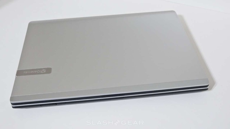 Gateway has made no small amount of effort to elevate the ID49C above its mainstream rivals, so you get a real aluminum skin on the lid and some reasonably tactile keyboard and palm-rest materials inside. The company has used a chiclet design for the keyboard itself, but it's definitely not the best we've used. There's a significant amount of bow in the middle of the 'board, leaving it feeling spongy and cheap, but more frustrating is Gateway's odd decision to use the row of keys on the far right for dedicated volume controls and a shortcut to their "Social Networks" app. We'd rather see them get buttons above the keyboard, as usual, and have page up/page down instead (which are relegated to Fn shortcuts with the arrow keys).