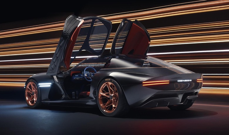 Butterfly doors offer both some visual drama and a more accessible cabin, and Genesis has thrown in some high tech gadgetry too with fingerprint scanning and biometric facial recognition for locking and unlocking the car. At the rear, there are flush Quad Lights and a carbon fiber surrounded diffuser. Midas metal copper picks out detailing and matches the huge wheels.