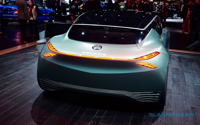 That checks off the usual "frivolous concept car" box, yes, but it also has practical implications. Genesis is thinking about the Mint's urban stomping grounds, and the need to gain access to the trunk even when in close confines of busy city parking. Similarly, the centrally-positioned charging port at the back should play nicely with EV chargers on either side of the car.