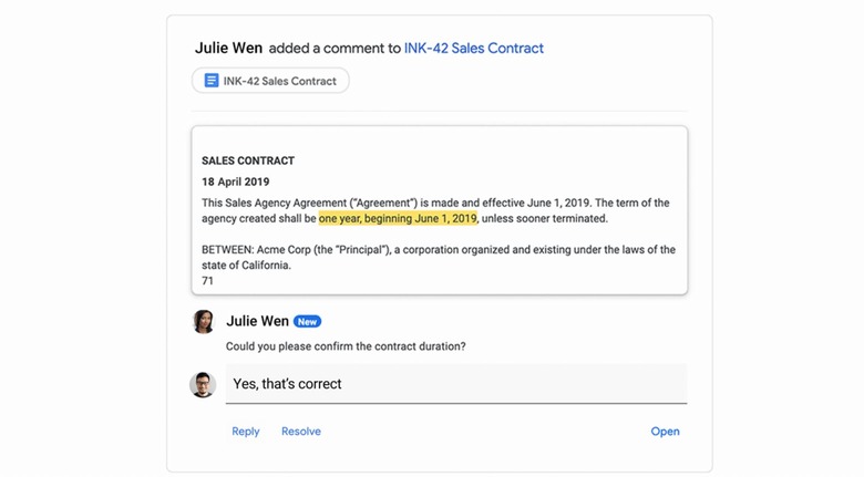 To solve this, Google is making Gmail messages more interactive. In its announcement today, Google gives a number of different examples of how this could be useful. For instance, in Google Docs, you'll be able to respond to new comments and mark issues as resolved in the email you receive when you're mentioned. The comment thread will even update within the email, saving you the trouble of visiting it in Docs.