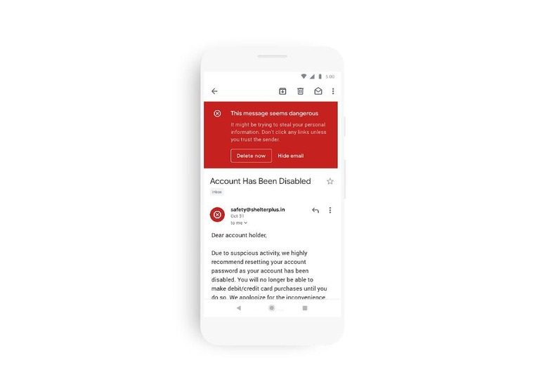 Google says that this new Gmail for mobile will alert users to potential phishing emails with a sizable alert that appears above the message once it's been opened. It turns out that this is where all of our red went, as the alert appears in a big red box that is impossible to miss among Gmail's all-white color scheme.