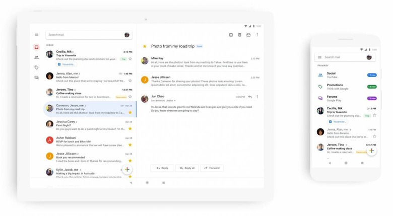 Just like the redesign that launched for Gmail for web last year, the app's new look is based on Google's Material Theme, which attempts to unify the designs of all of the company's different services. That, of course, means that a lot of the features that debuted last year will now be making their way to Gmail's mobile apps as well.