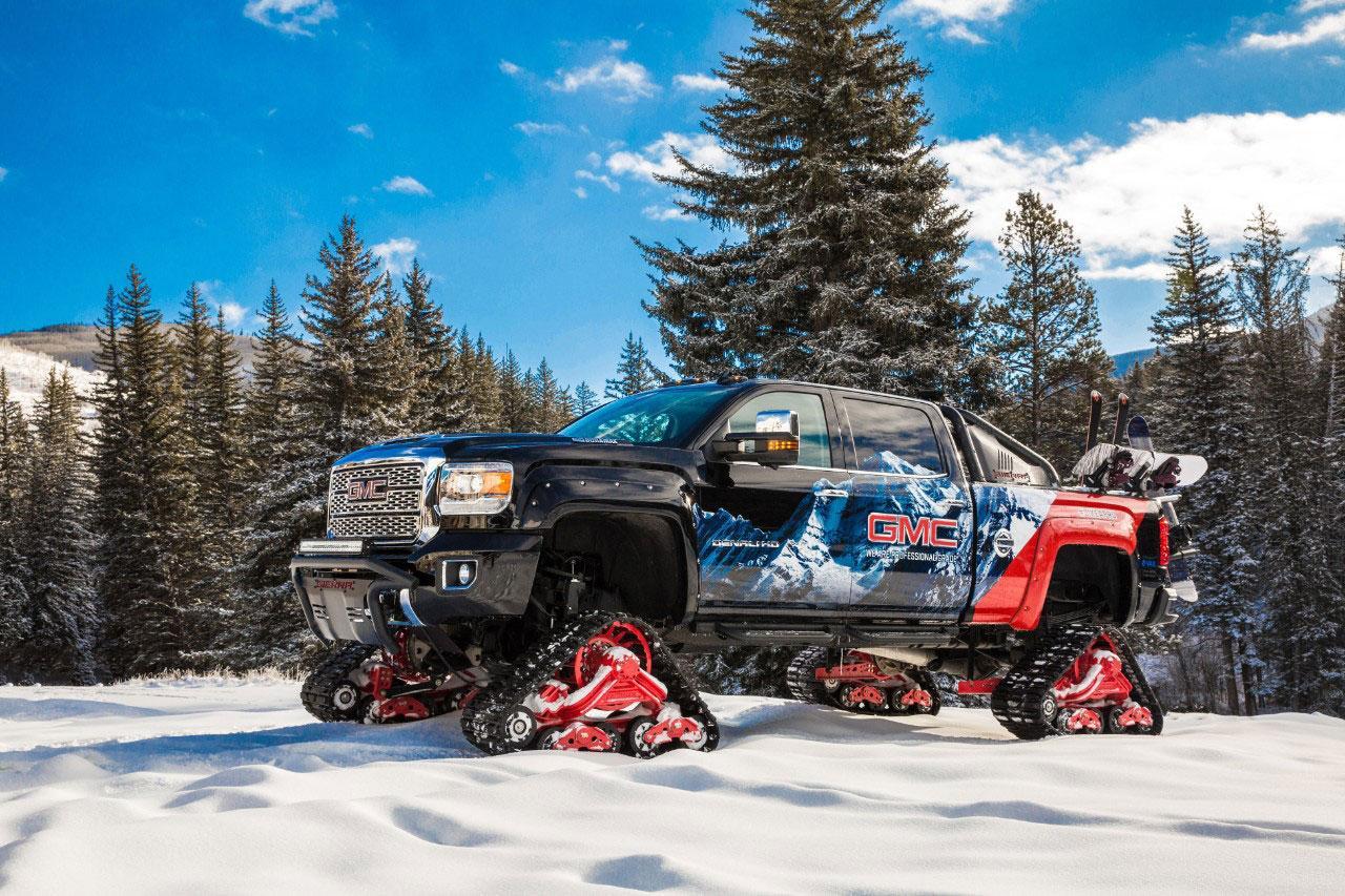 GMC has whipped up what might be the ultimate truck for conquering the snowy mountain roads and fields of Vail, Colorado. The truck is the 2018 GMC Sierra 2500HD All Mountain concept. The truck is said to be a one-of-a-kind snow-climbing machine. Rather than rolling on big wheels and tires, this concept has four tank-like treads.