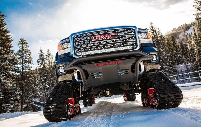 GMC has whipped up what might be the ultimate truck for conquering the snowy mountain roads and fields of Vail, Colorado. The truck is the 2018 GMC Sierra 2500HD All Mountain concept. The truck is said to be a one-of-a-kind snow-climbing machine. Rather than rolling on big wheels and tires, this concept has four tank-like treads.