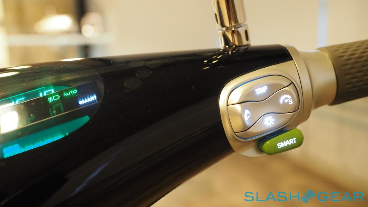 All of the lights are LEDs, from the headlights (using the same tech as in Audi's R8 and the Mercedes-Benz CLS, no less) to the turn signals, taillights, and hazards; the Smartscooter automatically powers down when the kickstand is deployed. More interesting, though, are the sensors woven through the bike, of which the digital compass, gravity, shock, ambient light, and thermo sensors total thirty in all.