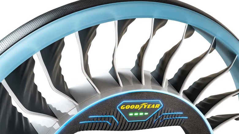 Goodyear says that allows the high rotating speeds required to drive the vehicle on the ground and when tilted to lift the vehicle into the air. Light-based fiber optic sensors could monitor road conditions, tire wear, and structural integrity of the tire itself.