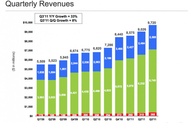 Google's 2011 third quarter earnings results are in and they've surpassed Wall Street expectations.The company is reporting $9.72 billion in revenue, which is a 33 percent increase from the same quarter last year. GAAP net income came in at $2.73 billion, up from $2.17 billion a year ago.