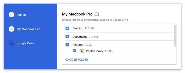 As the image above shows, you'll first need to sign into your Google account, then choose which folders on your computer you want backed up to the cloud. Once you do that, choose where in Google Drive you want the content stored. The tool takes care of the rest from there, making sure all items in the selected folders are properly stored in your cloud account.