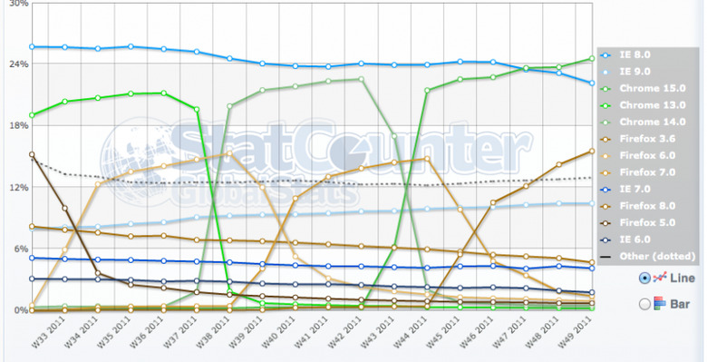 The folks at StatCounter are making the claim here that at the end of November of 2011, Chrome 15 made the monumental task a reality: beating out the newest version of Internet Explorer. This is the first time this has happened in quite a long time, and certainly will have the Internet Explorer team re-thinking their current method of updating their customers to the newest version of their software. What Google is doing right here, it seems, is making sure people have the automatic update feature of Chrome activated without a reason to turn it off. What you WONT notice anywhere else on the chart is a different version of Chrome – fun, huh?