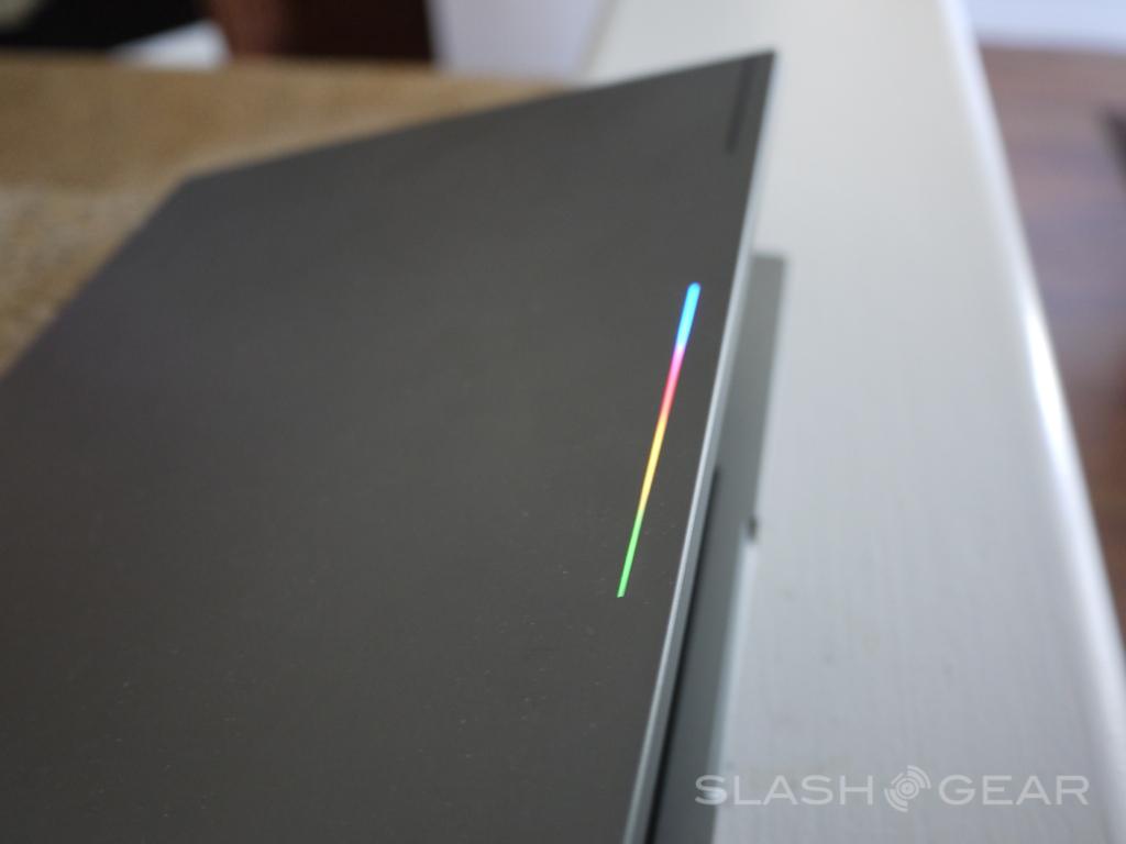 Then we have that awesome notification light on back which has all sorts of glowing colors. It's blue during use, white while on standby, and will let the people behind you know the battery is low by glowing red. Sadly you won't see it, but the OS will let you know so don't worry. Then on open and close you'll get a neat little rainbow of Google colors. It's a neat little extra polish, and we like that Google's keeping things fun. Sadly we don't like the large and cumbersome charger that came included, however it also features a ring LED with green, yellow, and red for when you're charging.