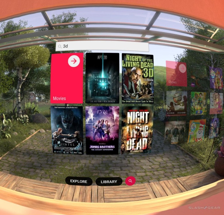YouTube VR allows the viewing of spherical videos, and Google Play Movies allows viewing movies and TV shows on a flat screen. Google Play Movies app shows a very simple UI in which the user selects titles and plays them. Once played, the selection UI turns to a flat screen while the user sits and watches in a 3D environment.