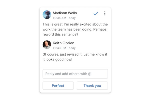 Smart Replies enables users to click a suggested response to an existing comment, shaving precious seconds off one's workload so that time isn't waste typing out simple replies. One example provided by Google on its Workspace blog are "Perfect" and "Thank you" suggested replies to a comment noting that the document had been updated.