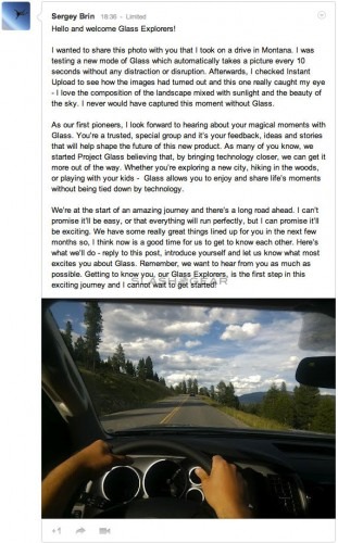 This afternoon no less than Google's Sergey Brin send out an update on Project Glass in the form of a special invite-only program in which Google+ will be a place for a limited set of future users of the hardware will be able to get special updates. The first of these updates includes Brin speaking about how he used Project Glass and a brand new app with the hardware to take photos of a trip he was on ever 10 seconds automatically. The one shot he shared was a fabulous in-car photo that might never have existed had he not been using the AR glasses in real life.