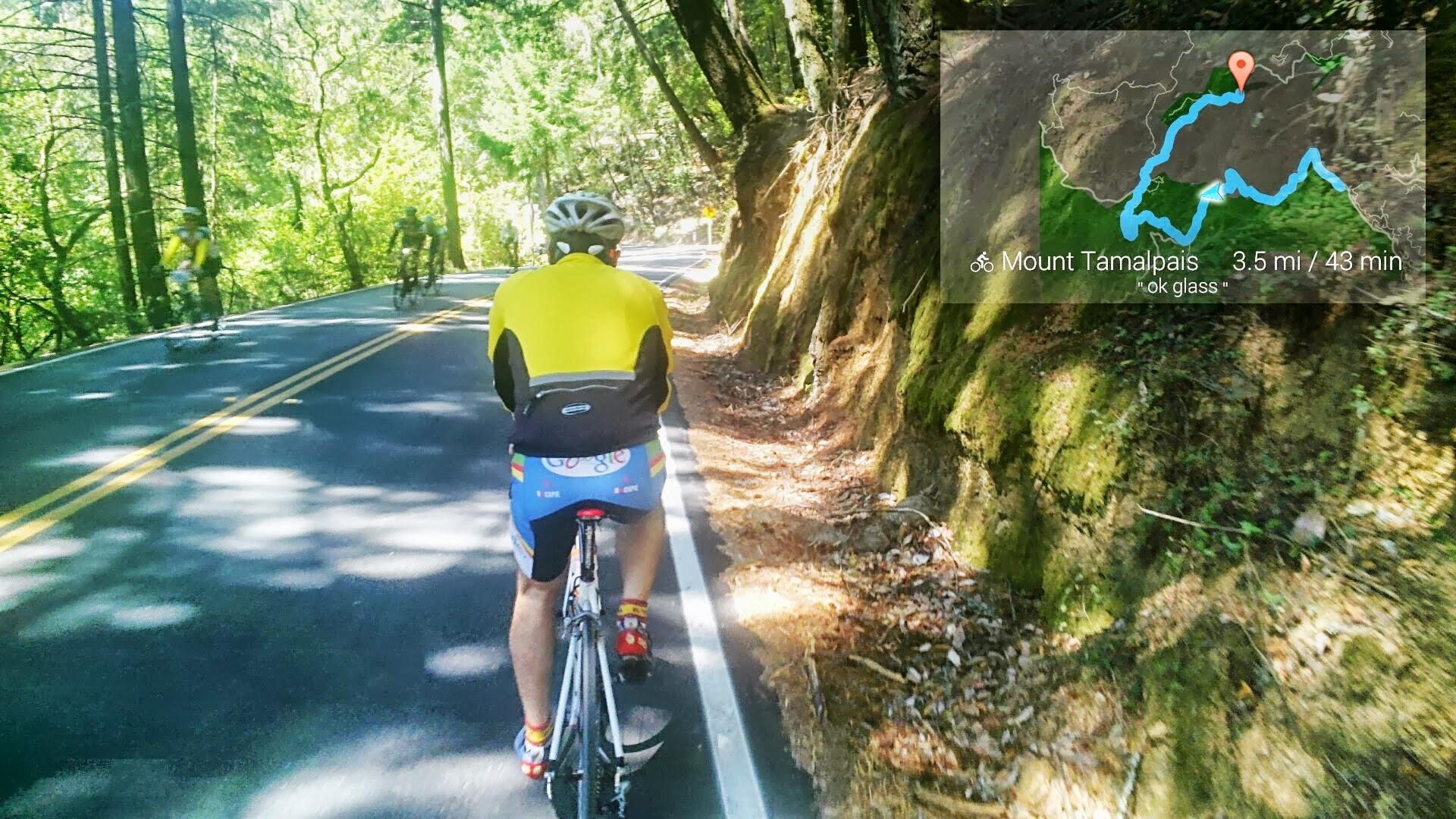 As for Google Glass Vignetting, that gives photos from the headset a glimpse at the private display the wearer was seeing. By choosing "Make Vignette" from the menu, a photo is snapped with a screenshot of the display set into the corner, such as showing what route you're taking on a bike ride, what point of interest you're being introduced to via Field Trip, or just the time and date of an event.