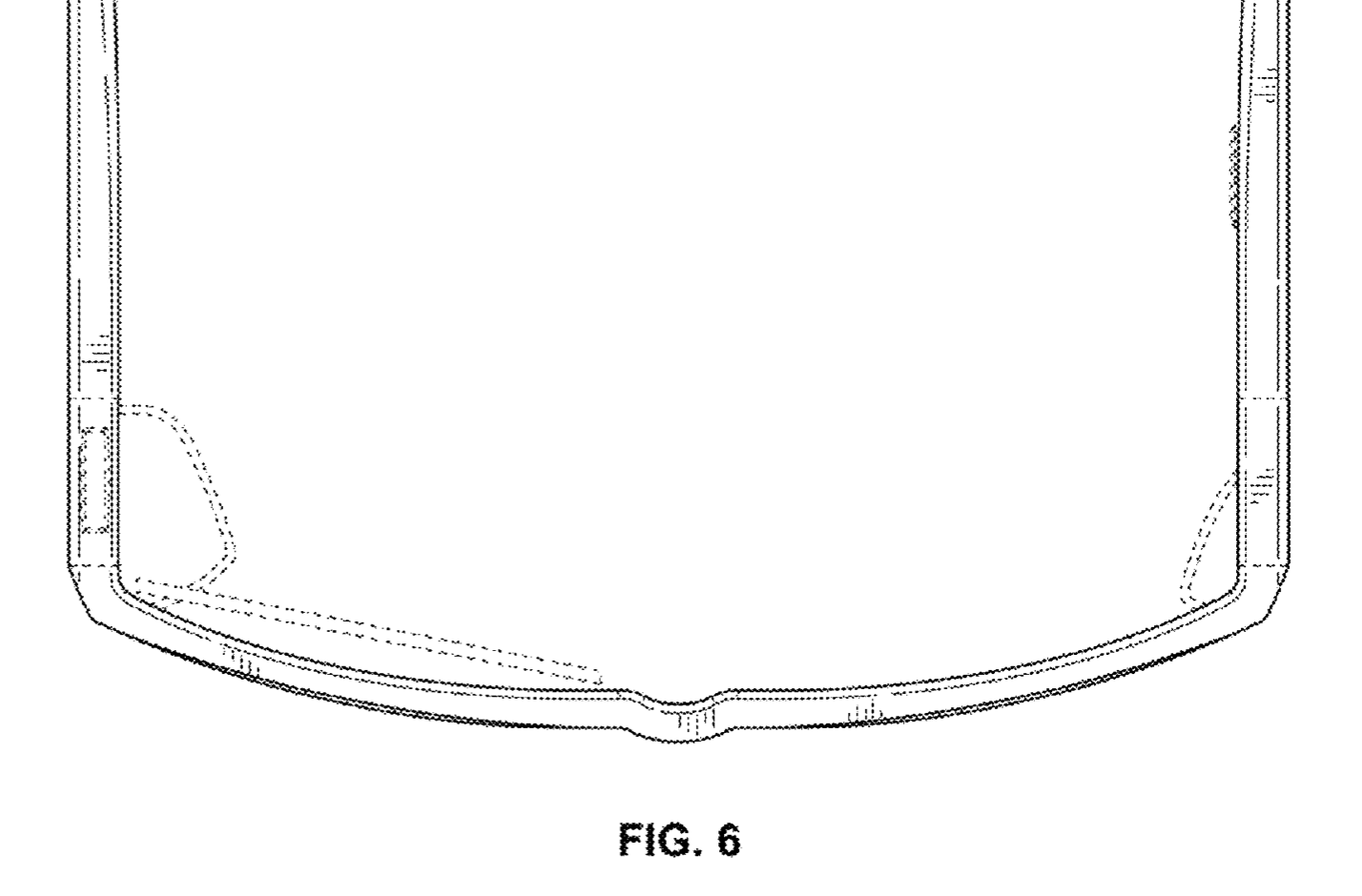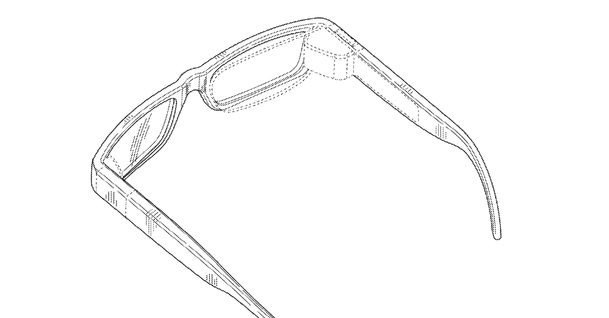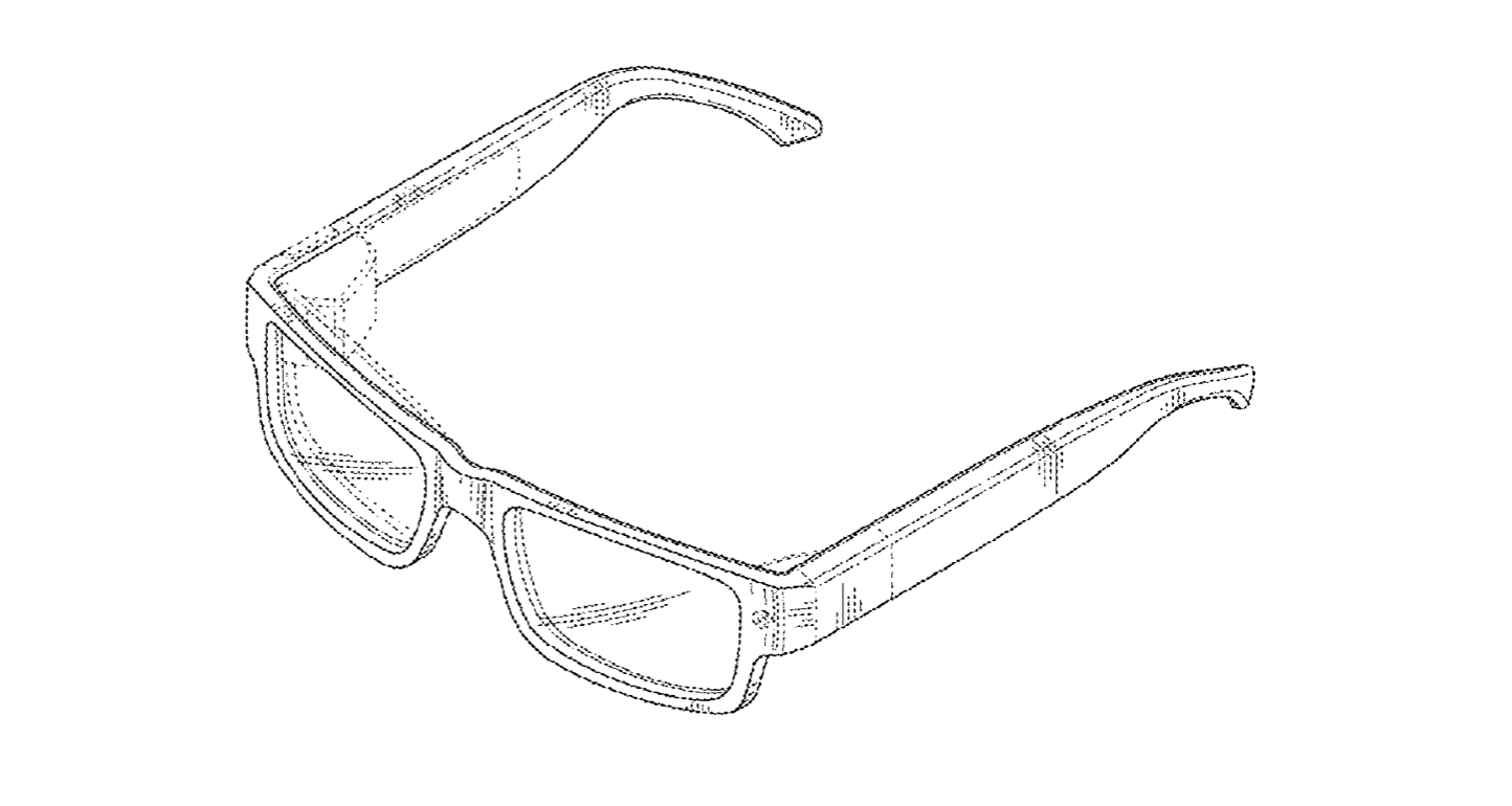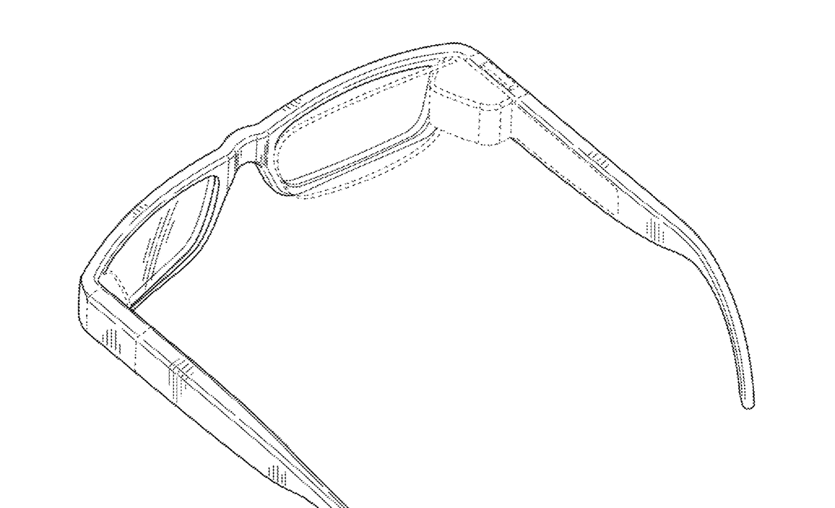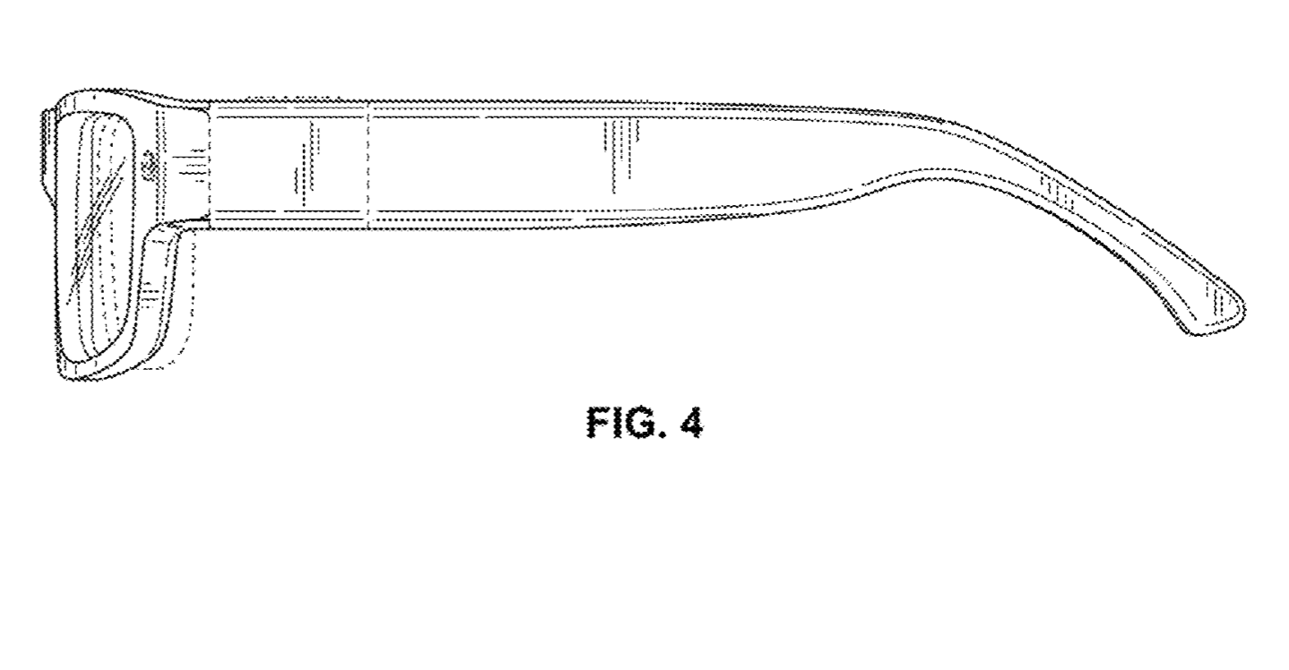 The new patent hides the offending parts, though. The small screen is tucked behind the actual frames, and looks like it might project to the entire glass eyepiece. A small hole on the other side of the frames suggests the camera may have been moved to the opposite side.
