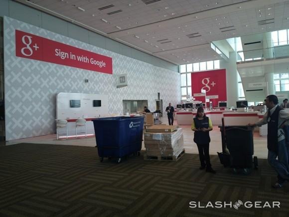 On the second floor (or first floor, if you're German), you'll find a massive Google+ presence where users are encouraged to sign-in with the social network. A deck with Office Hours is set up for developers to learn how they might integrate Google+ into their own software. This area has a series of live hang-out portals which we're sure will be popping up this week.