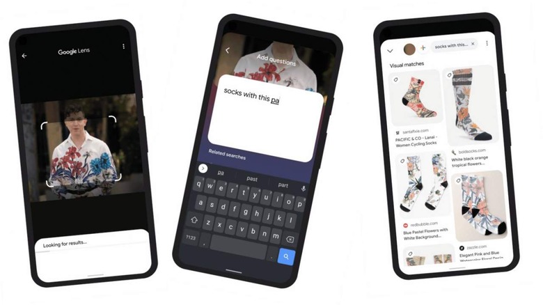 Google showed an example of this expanded set of capabilities with an image of a shirt with a floral pattern. The user taps the Lens icon (Google Lens) and types "socks with this pattern", and Google understands what's being sought. This new search system uses a combination of image and text elements in a single query to get results.