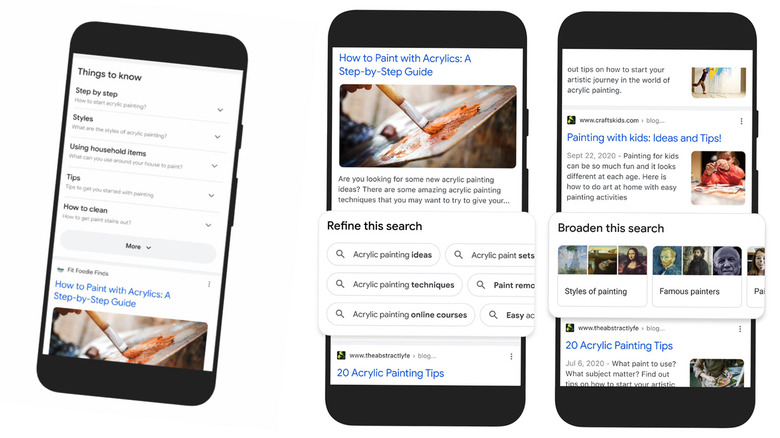 Google Search will soon show expanded results with a section called "Things to know." With Things to know, Google uses their understanding of how people "typically explore" your topic of choice (your search terms). Take for example a search for "acrylic painting" – Google will show a Things to know section with titles like "step by step", "how to clean", and "styles" with links to articles, guides, and videos.